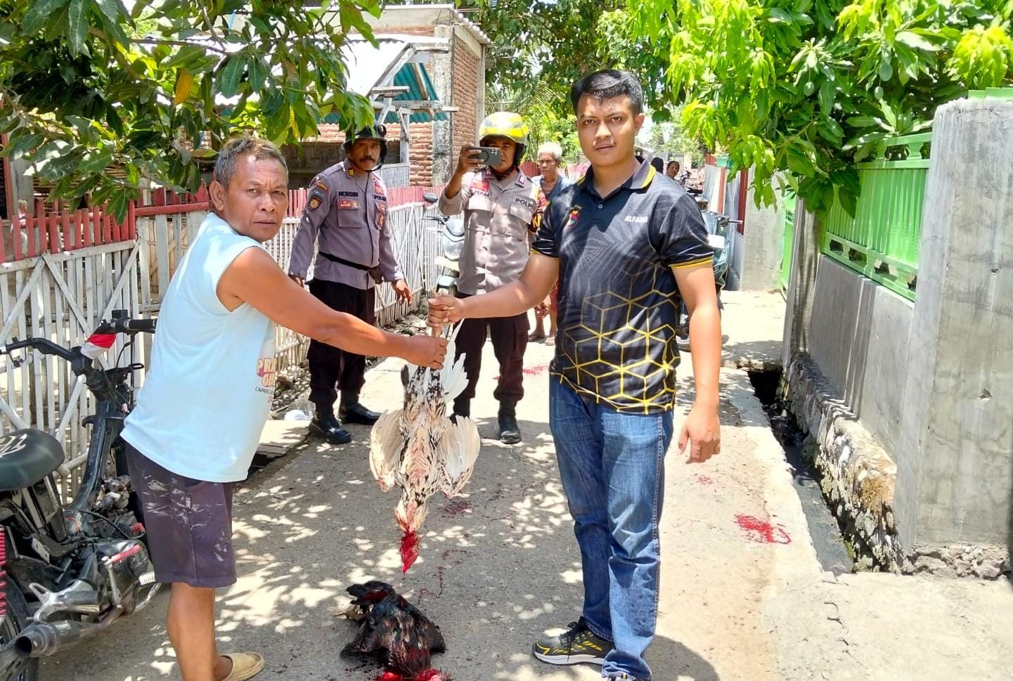 Dalam kegiatan itu petugas berhasil mengamankan 2 Ekor ayam aduan yang langsung di sembelih serta alat peragannya ikut di sita.