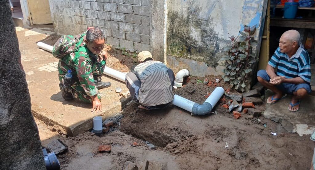 Dalam suasana penuh semangat kebersamaan, Babinsa bersama warga tampak bahu-membahu membersihkan dan memperbaiki saluran air yang tersumbat akibat endapan lumpur serta sampah rumah tangga. Tak hanya memberi arahan, Serka Agus turut turun langsung ke parit sempit di antara rumah warga, mengangkat tanah, dan membantu proses pemasangan batu bata saluran air.