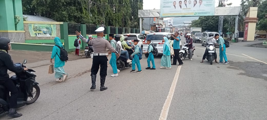 Dalam kegiatan tersebut, personel Unit Lantas membantu para pelajar yang hendak menyeberang jalan serta mengatur arus lalu lintas agar tetap tertib dan lancar, terutama saat banyaknya aktivitas masyarakat pada pagi hari.