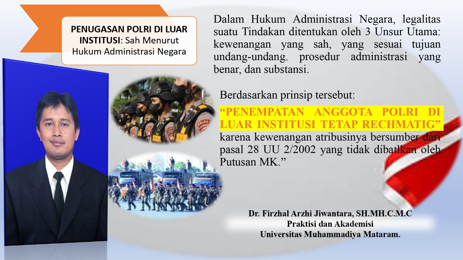 “Dalam ntb.ceria.web.id/tag/hukum/”>Hukum Administrasi Negara, legalitas suatu tindakan pemerintahan ditentukan oleh tiga unsur utama: kewenangan yang sah, prosedur administratif yang benar, dan substansi yang sesuai tujuan undang-undang. Berdasarkan prinsip tersebut, penempatan anggota Polri di luar institusi tetap rechtmatig, karena kewenangan atribusinya bersumber dari Pasal 28 UU 2/2002 yang tidak dibatalkan oleh Putusan MK.”