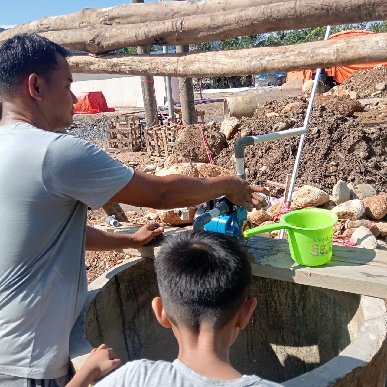 Kegiatan tersebut difokuskan pada pembangunan empat titik sumur cincin guna memastikan ketersediaan air bersih bagi warga yang menempati hunian sementara. Hingga hari ini, progres pembangunan menunjukkan hasil yang signifikan.