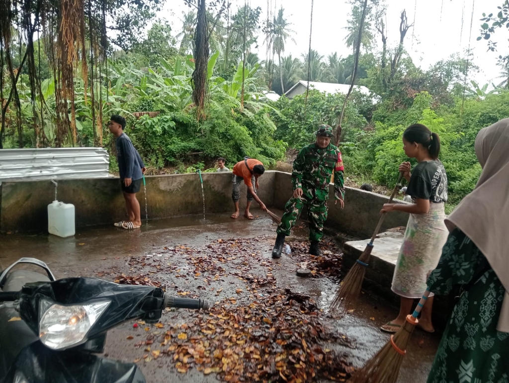 Dengan peralatan sederhana dan semangat gotong royong, peserta bahu-membahu membersihkan area sekitar mata air dari sampah, rumput liar, dan endapan yang berpotensi mencemari sumber air. Suasana kebersamaan terasa hangat, memperlihatkan kuatnya ikatan sosial antara TNI dan masyarakat binaan.