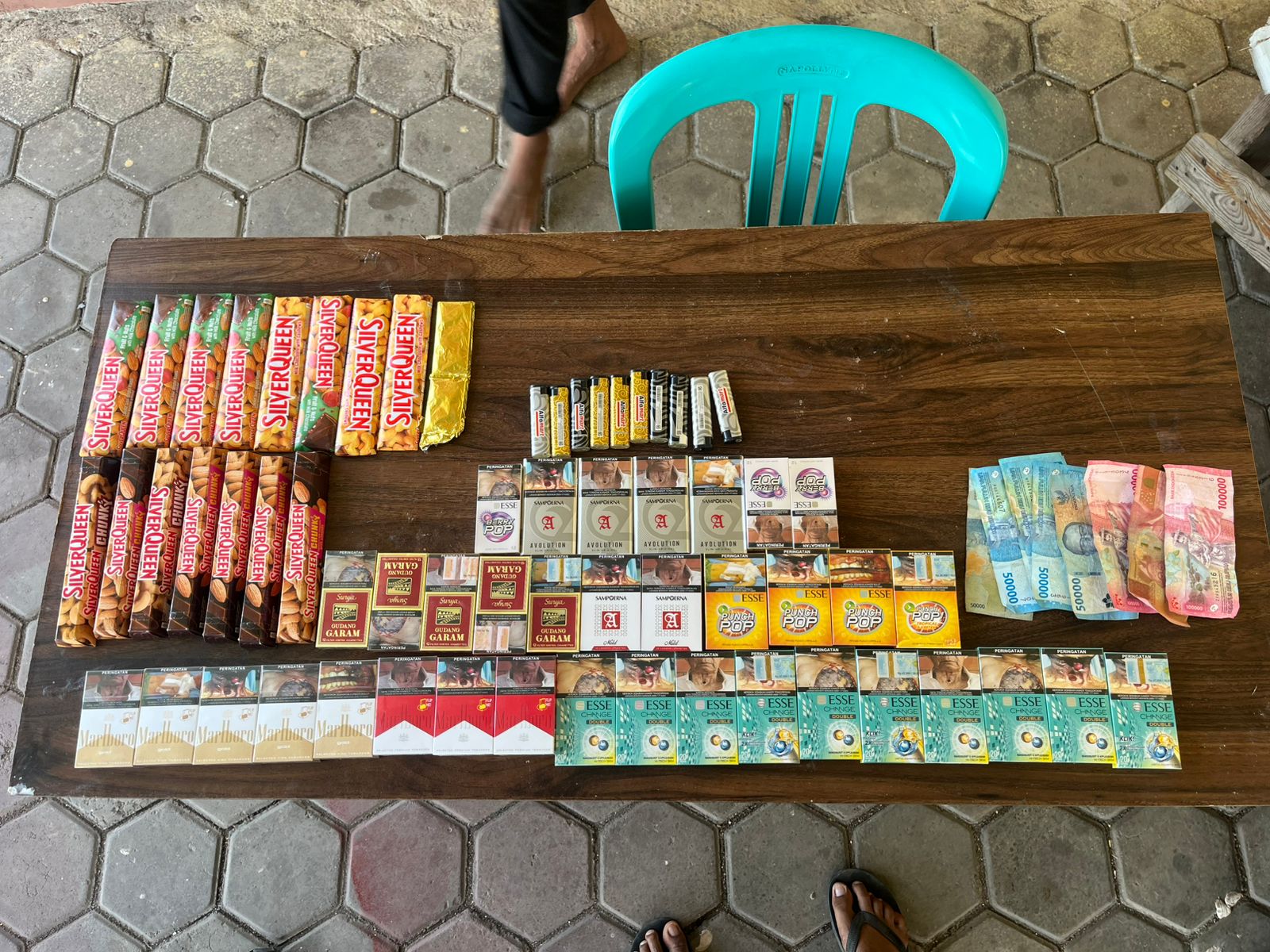 Dari hasil penangkapan, polisi turut mengamankan sejumlah barang bukti, di antaranya 32 bungkus rokok berbagai merek, 10 buah korek gas, uang tunai Rp600.000, 16 bungkus cokelat SilverQueen ukuran besar, serta alat yang digunakan pelaku berupa satu buah tang dan satu buah betel.