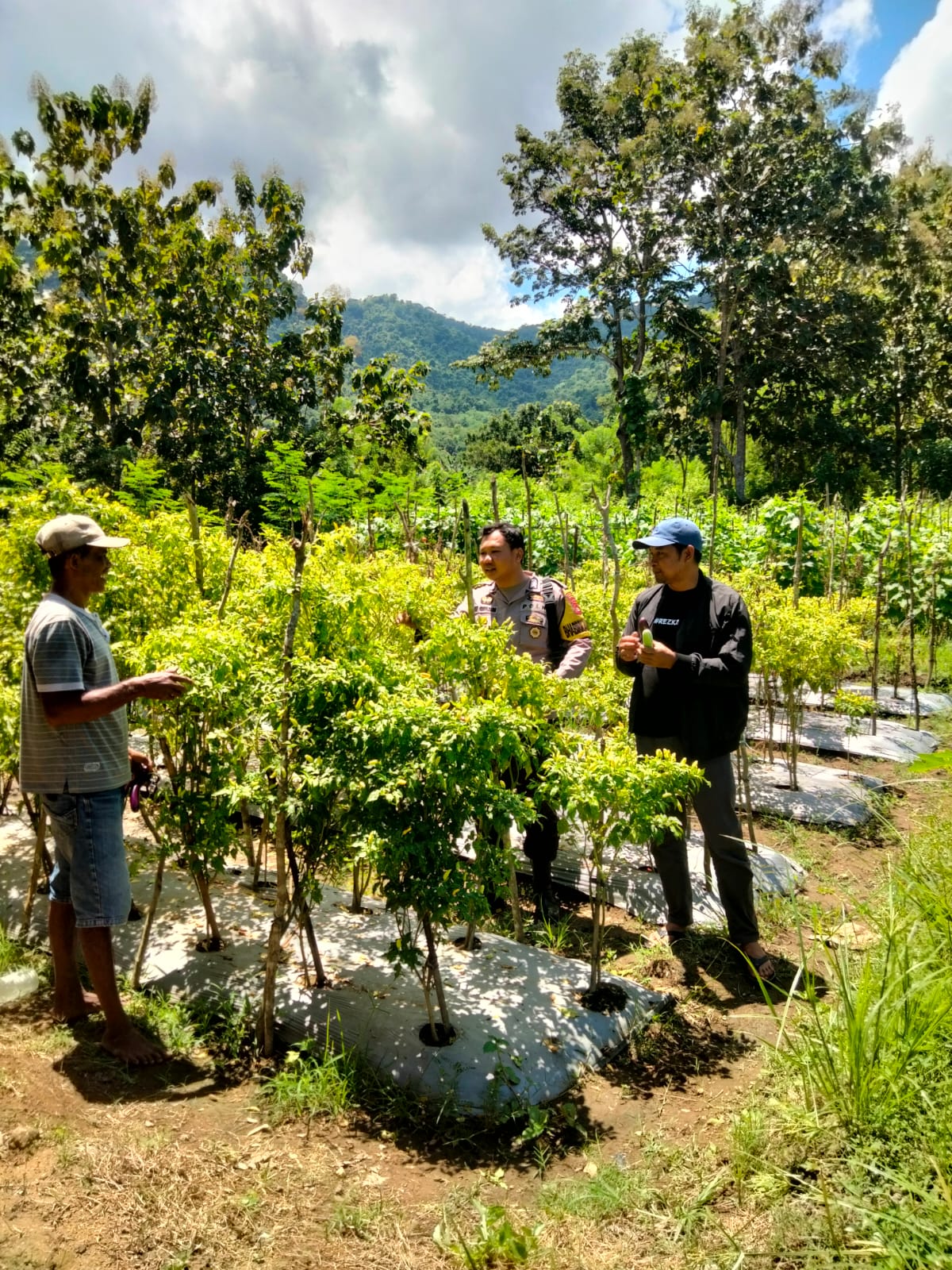 Dalam pelaksanaannya, Bhabinkamtibmas melakukan pendampingan langsung terhadap salah satu warga yang memanfaatkan lahan untuk menanam berbagai komoditas, seperti cabai dan tanaman produktif lainnya.