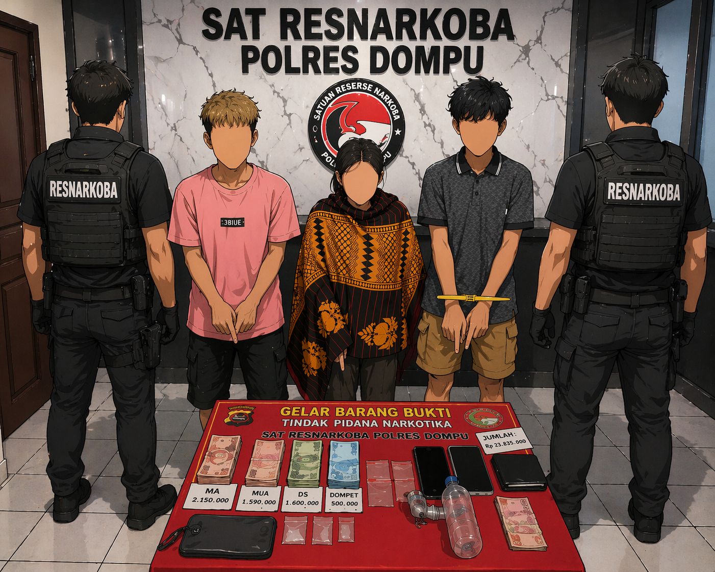 Satuan Reserse ntb.ceria.web.id/tag/narkoba/”>Narkoba Polres Dompu kembali menunjukkan komitmennya dalam memberantas peredaran narkotika di wilayah hukum Kabupaten Dompu. Kali ini, tiga orang terduga pelaku tindak pidana narkotika jenis sabu berhasil diamankan dalam sebuah operasi di Kecamatan Kempo.