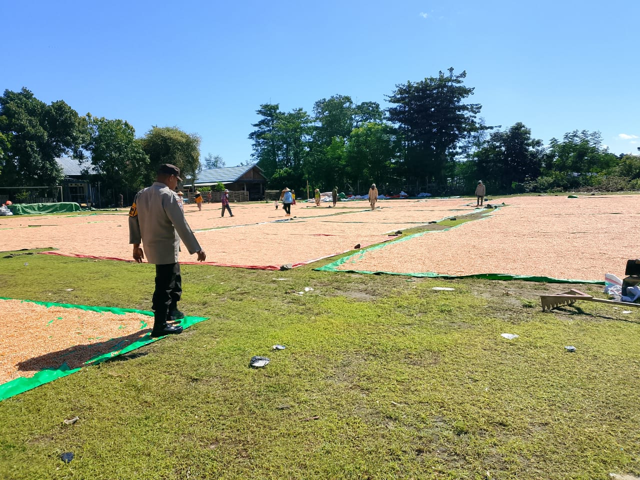 Dalam pelaksanaan kegiatan, Bhabinkamtibmas melakukan pemantauan langsung terhadap proses penjemuran jagung hasil panen serta berdialog dengan petani terkait kondisi pertanian dan distribusi hasil panen.