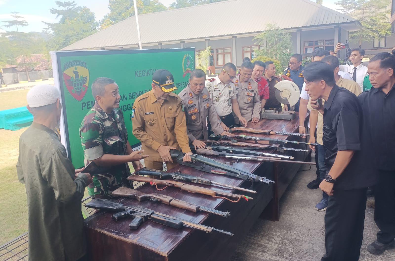 Puluhan senjata dipotong menggunakan mesin pemotong besi agar tidak bisa digunakan kembali.